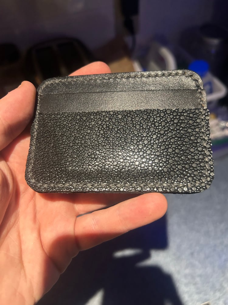 This well polished black stingray gives off a mirror like shine. Can comfortably hold 4 cards with a cash pocket in the middle. This product will ship as is in the picture.